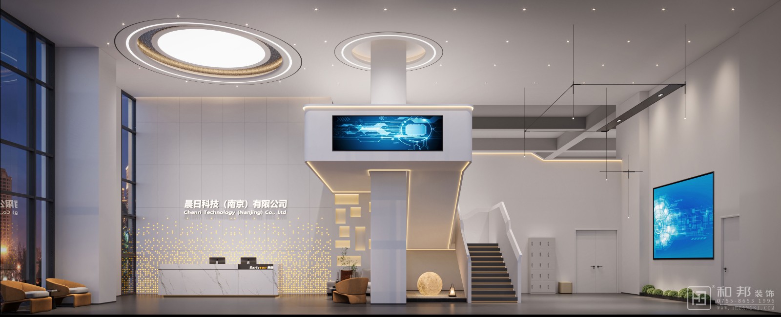 設計說明本案以 “宇宙探索” 為脈絡,頂面圓環似恒星散發能量,接待區星光點飾如宇宙塵埃。樓梯旁球形燈模擬月球,呼應 “晨日” 之名,將科技公司與日月星辰關聯,營造充滿想象力的宇宙探索氛圍,讓空間成為連接現實與宇宙遐想的載體 。
